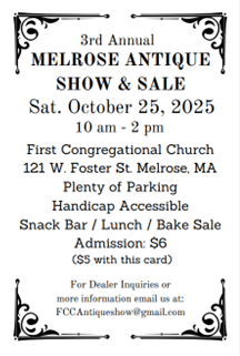 First Congregational Church in Melrose, UCC, will host its Third Annual Antique Show & Sale on Saturday October 25, 2025 from 10am-2pm at 121 West Foster Street in Melrose, MA.